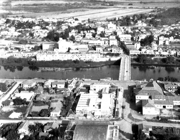 Foto aérea feita da altura da rua Geraldo Spettmann, vendo o Centro da cidade e a antiga catedral, no morro, em 1965.