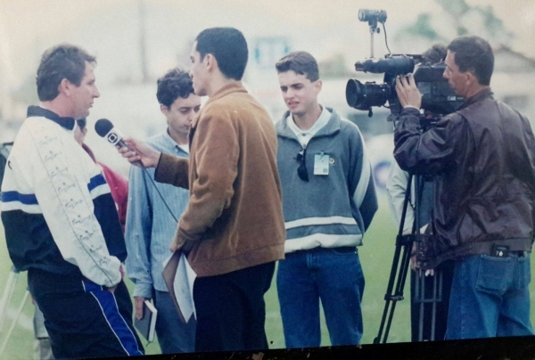 Técnico do Tubarão em 2001, Nestor Simionato, em entrevista aos jornalistas André Bianchini, Rodrigo Speck e Marcelo Becker e o cinegrafista Nereu Filho. Registro feito por Ulisses Job.