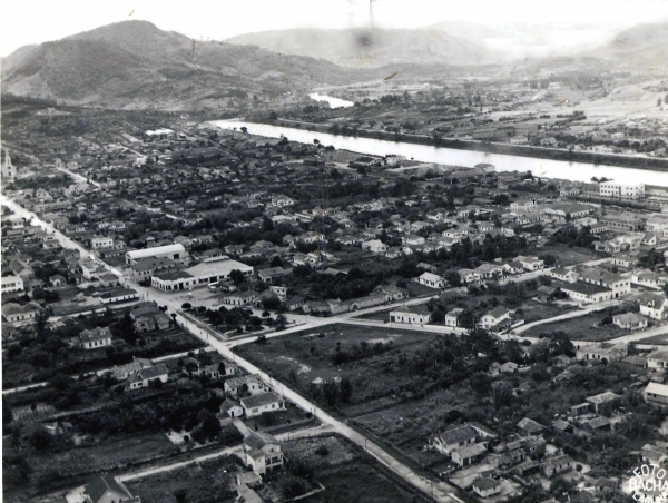 Foto aérea de Tubarão mostrando a rua Altamiro Guimarães, sentido cemitério-Oficinas, onde é possível ver o antigo prédio da Casan, em 1960.