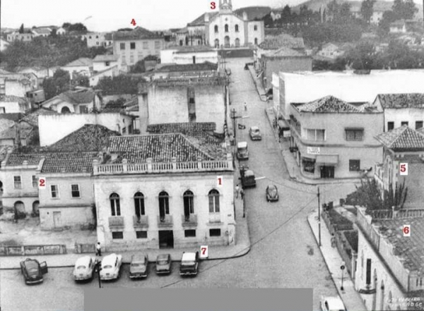 Área central de Tubarão em 1965. Na imagem é possível ver o Palacete Cabral (figura 1), onde funcionava a prefeitura e a Câmara, o antigo Fórum e delegacia (2), a igreja (3), o edifício Dom Joaquim (4), Palacete Balsini (5), Palacete Frederico Alfredo (6) e o ponto de táxi (7).