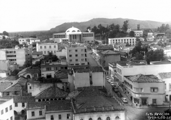 Imagem mostra ainda os escombros da antiga igreja em frente à Catedral de Tubarão, em 1971.