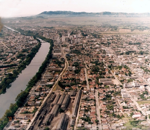 Foto feita do Morro da Caixa d’Água, mostrando a oficina da estrada de ferro, o Rio Tubarão e o Centro da cidade, em 1995.