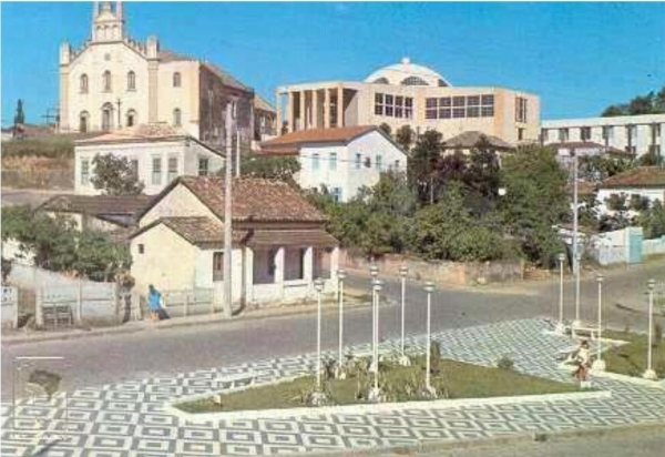 Vista das duas catedrais de Tubarão. A nova foi construída aos fundos da antiga, que depois foi demolida.