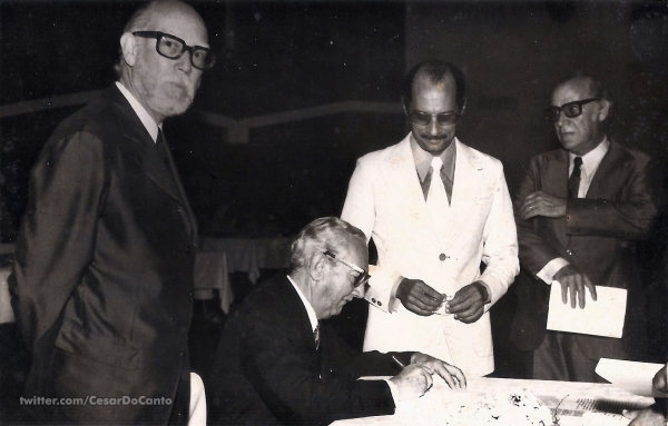 Walter autografando “Este Meu Tubarão”, em 1974. Na imagem ainda aparecem Willy Zumblick, César Machado e Carlos Corbetta.