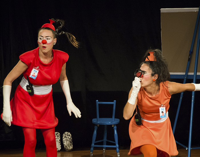 O resultado começou a surgir nos primeiros encontros. “Fomos ensaiar e a primeira ação foi uma intervenção em bairros de Florianópolis. Saímos pelas ruas como palhaças-pesquisadoras do Instituto Mudanças, perguntando para as pessoas: ‘Como lidar com os seres humanos?’. A gente entrevistava e as pessoas entravam na brincadeira”, relata Gabriela Leite, uma das atrizes da companhia, que interpreta a palhaça Flor.