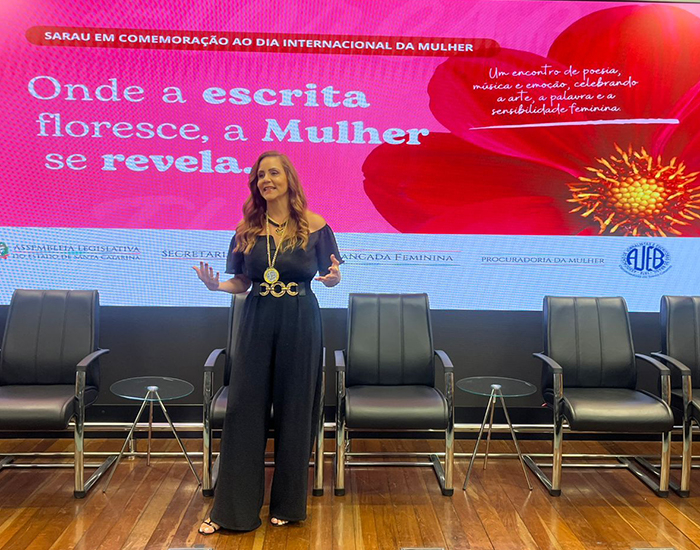 A jornalista e escritora Renata Dal-Bó, colunista do Diário do Sul, participou no dia 10 de março de um sarau em comemoração ao Dia Internacional da Mulher, realizado no Plenarinho da Assembleia Legislativa de Santa Catarina (Alesc), em Florianópolis. O encontro reuniu escritoras, artistas e convidadas em uma programação voltada à literatura e à valorização da expressão feminina na cultura.