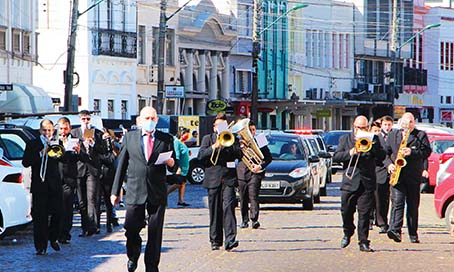 Elvis Palma/DS Música para acalmar a alma e levar um pouco de alegria às pessoas que hoje estão em tensão permanente por conta da pandemia do coronavírus. Com este objetivo, a Sociedade Musical União dos Artistas, de Laguna, se apresentou no Centro Histórico, nesse sábado.